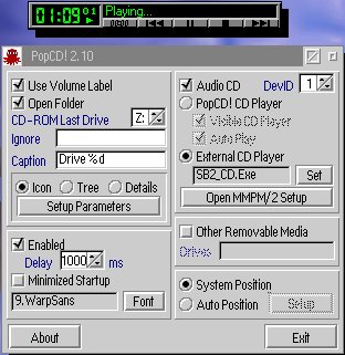 A Pretty Pop Software megjelentette a PopCD ! 2.10-es verzióját. A PopCD ! (a fejlesztök definíciója szerint): "Pop Up CD-ROM/Removable media/Audio CD Object" segédprogram. A beállításoknál meg lehet adni, hogy a PopCD ! mennyi idöközönként figyelje a CD meghajtót (vagy más cserélhetö médiát), és a pár pillanattal késöbb megjelenik egy objektum a desktop-on, amin az open/play lehetöségek érhetök el, annak függvényében, hogy adat vagy hang található a kiválasztott háttértárolón. A programhoz bármilyen külsö CD lejátszót hozzárendelhetünk a hang CD-k lejátszásához. A PopCD ! futásához szükség van a az EMX könyvtár 0.9c (vagy magasabb) verziójára és a Watcom VX-REXX futtatómodulra (VROBJ.DLL) is.